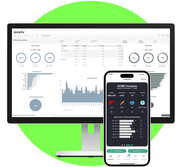 入場者数や時間や検知レベルごとの警報率などのEvolv Expressの情報を一元化してダッシュボードで確認できます。機器のパフォーマンスや訪問者の流れの状態をデータで把握でき、セキュリティ効果の確認や警備計画立案・改善に活用することができます。スマートフォンでの確認も可能です。